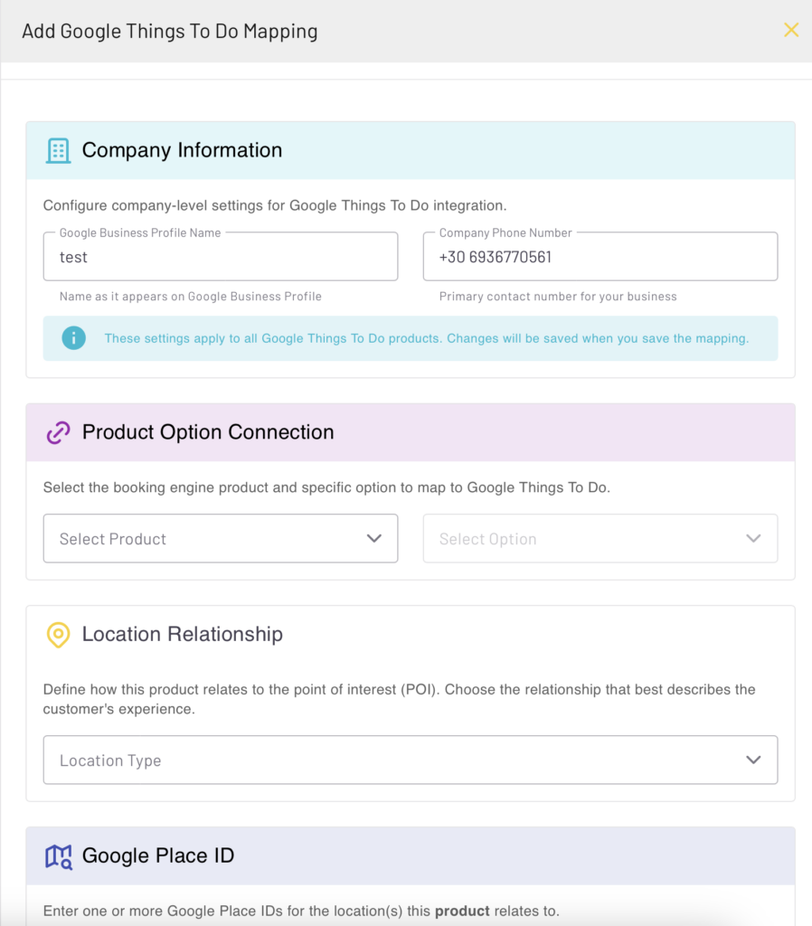 - Map product → option → location → Google Place ID